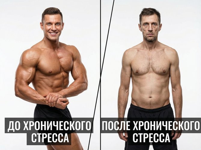 Хронически высокий кортизол запускает распад мышечной ткани. Организм расценивает постоянный стресс как сигнал опасности и начинает «экономить ресурсы» — а мышцы требуют много энергии на поддержание.