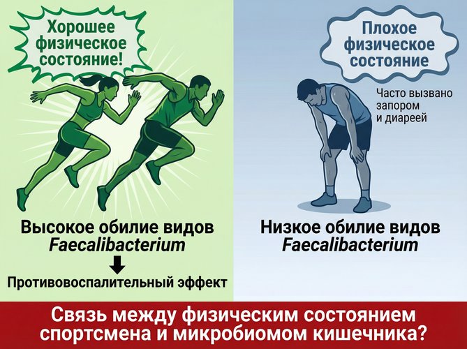 Высокая численность Faecalibacterium (зелёный силуэт) соответствует хорошей форме и меньшему воспалению, тогда как низкая численность (серый силуэт) наблюдается у атлетов с жалобами на плохое самочувствие (частые запоры, диарея). Например, исследование с участием элитных атлетов показало, что спортсмены, которые ощущали себя в отличной физической форме, имели значительно больше бактерий рода Faecalibacterium в кишечнике, чем те, кто отмечал проблемы со здоровьем. Faecalibacterium prausnitzii обладает выраженным противовоспалительным действием, поэтому её высокая численность помогает сдерживать воспаление вследствие интенсивных нагрузок. Соответственно, недостаток таких «полезных» бактерий часто выявляется у спортсменов с жалобами на хронические проблемы ЖКТ и снижение тонуса, что подчёркивает связь состава микробиоты с физическим состоянием атлета.