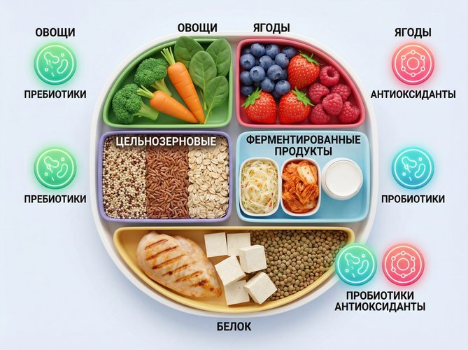 Разнообразное питание, богатое пребиотиками. Составьте рацион так, чтобы в неделю потреблять не менее 30 различных натуральных продуктов. Включайте овощи (брокколи, цветная капуста, морковь), цельнозерновые (овёс, ячмень, киноа), бобовые (чечевица, нут) и фрукты (бананы, яблоки, груши). Эти продукты содержат пребиотические пищевые волокна – топливо для полезных бактерий. Пребиотики ферментируются микробиотой в толстом кишечнике, в результате чего образуются те самые короткоцепочечные жирные кислоты (бутират, пропионат, ацетат), которые уменьшают воспаление и ускоряют восстановление мышц после тренировки.