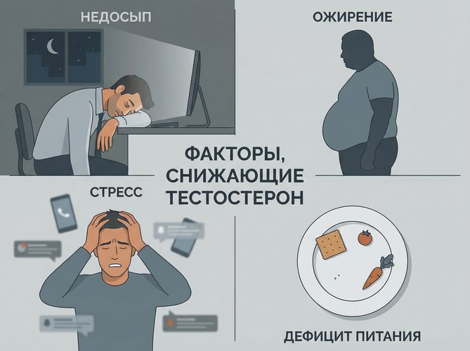 Параллельно исправьте то, что чаще всего снижает тестостерон: недосып, лишний вес, хронический стресс, дефицит калорий, алкоголь, апноэ сна.